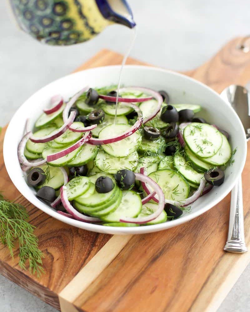 - Prepare dressing: In a small bowl, combine sour cream, apple cider vinegar, olive oil, garlic powder, dill, salt and pepper.